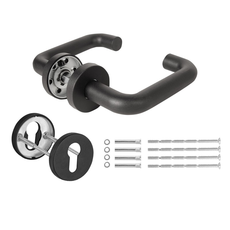 Комплект DH-0219 NE предназначен для комплектации всех противопожарных замков. Пружина препятствует провисанию ручки, облегчает работу привода замка. Квадрат 9 х 140 мм.Материал ручки: нескользящий огнеупорный нейлон. Материал основания: оцинкованная сталь. Накладки в комплекте. Цвет: черный.