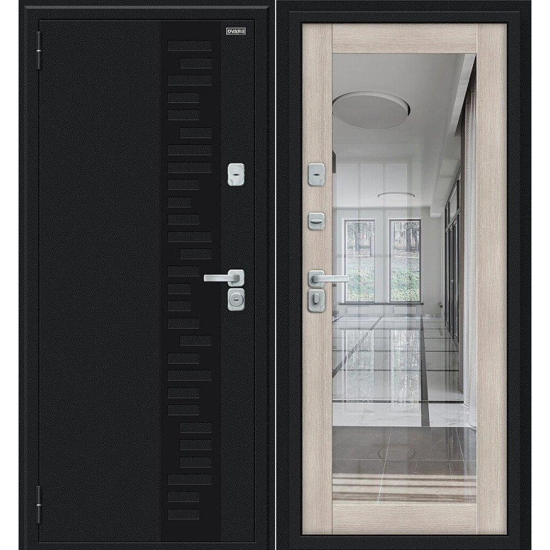 Стальной дверной блок Thermo Флэш Декор-2 Букле черное/Cappuccino Veralinga 205*86 левая энергосберегающей конструкции с двойным терморазрывом (термомостом) из натуральной пробки и четырехконтурным уплотнением. Поставляется с правым и левым открыванием наружу.